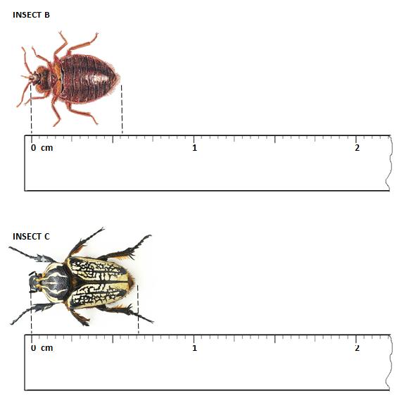 Ibrahim is conducting a science experiment measuring the lengths of insects using a special ruler.