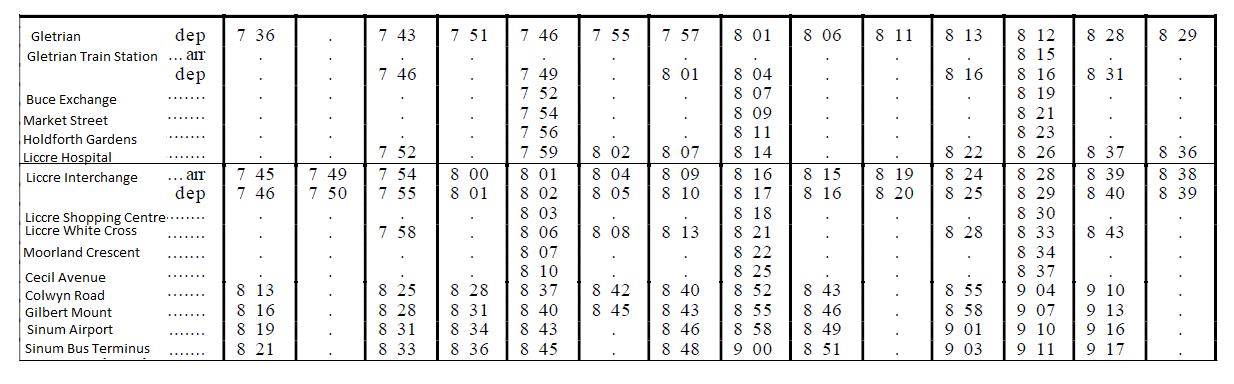 Part of the bus timetable for services from Gletrian to Sinum is shown below.