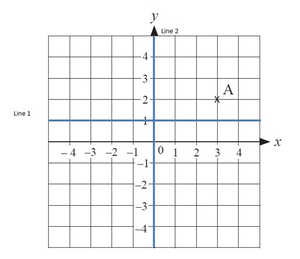 Point A is reflected in line 1 and then the new point is reflected in line 2 to form point B.