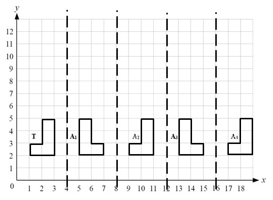 The shape T is reflected in the line `y = 4` to form the image `A_1`.