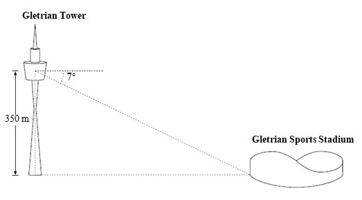 The angle of depression from the observation deck to the Gletrian football ground is `7°`.