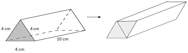 The Equichoc Bar is in the shape of a triangular prism of side 4 cm and length 10 cm as shown.
