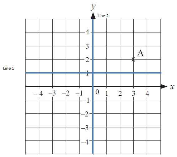 Point A is reflected in line 1 and then the new point is reflected in line 2 to form point B.
